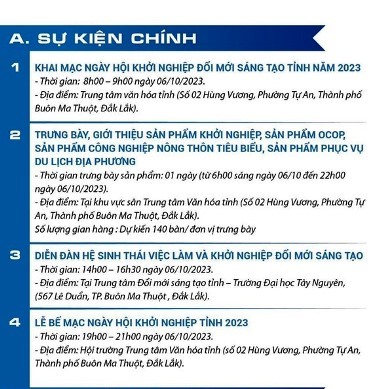Ngày hội sẽ diễn ra các sự kiện chính, như: Lễ khai mạc, bế mạc Ngày hội; trưng bày, giới thiệu sản phẩm khởi nghiệp, sản phẩm OCOP, sản phẩm công nghiệp nông thôn tiêu biểu, sản phẩm khoa học công nghệ; Hội thảo “Hỗ trợ doanh nghiệp chủ động thích ứng, phục hồi và phát triển bền vững trên địa bàn tỉnh Đắk Lắk; Hội nghị “Kết nối cung cầu tiêu thụ hàng hóa sản xuất theo chuỗi cung ứng”; Hội thảo “Giải pháp sản xuất, kinh doanh nông sản thực phẩm an toàn góp phần thực hiện tiêu chí 3 sạch”; Diễn đàn Hệ sinh thái việc làm và khởi nghiệp đổi mới sáng tạo.
