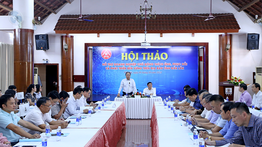 gày 5/10, UBND tỉnh Đắk Lắk tổ chức Hội thảo hỗ trợ doanh nghiệp chủ động thích ứng, phục hồi và phát triển bền vững. Đồng chí Nguyễn Tuấn Hà – Phó Chủ tịch Thường trực UBND tỉnh, lãnh đạo Sở Kế hoạch và Đầu tư cùng chủ trì Hội thảo.