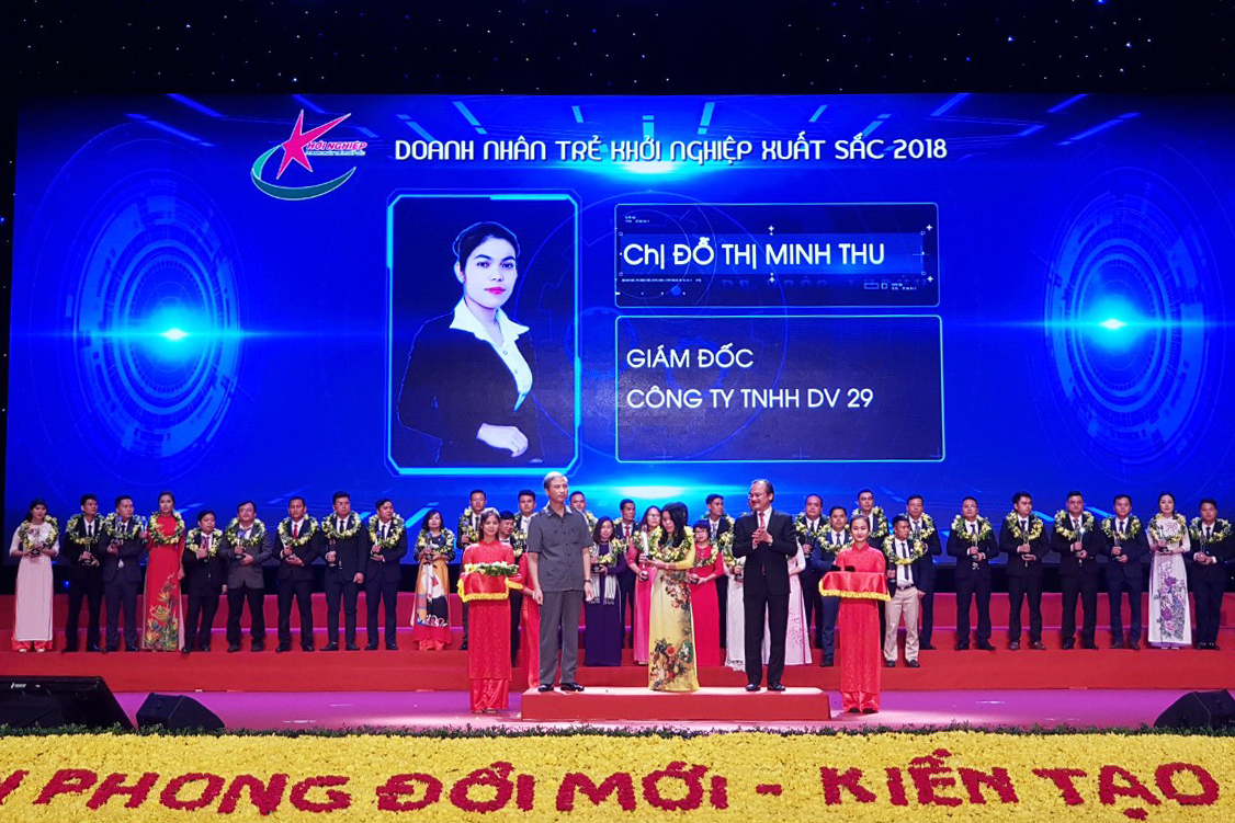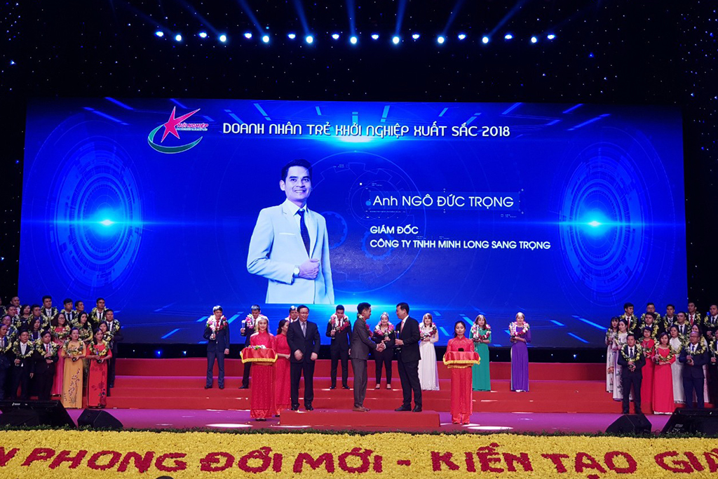 Doanh nhân Ngô Đức Trọng và Đỗ Thị Minh Thu của Đoàn Đắk Lắk tại Lễ vinh danh Trong đó, Top 10 Doanh nhân trẻ khởi nghiệp xuất sắc 2018 đã tạo ra doanh thu 1.231 tỷ đồng năm 2017, lợi nhuận đạt 75 tỷ đồng, nộp ngân sách 55 tỷ đồng, giải quyết việc làm cho 1.637 lao động. Đoàn đại biểu Đắk Lắk có 2 doanh nhân trẻ được tôn vinh đó là Doanh nhân Ngô Đức Trọng, Giám đốc Công ty TNHH Minh Long Sang Trọng đã đứng trong top 10 và Doanh nhân Đỗ Thị Minh Thu – Giám đốc Công ty TNHH Dịch vụ 29 đứng trong top 100 doanh nhân trẻ khởi nghiệp xuất sắc năm 2018.Nguồn: Cổng thông tin điện tử tỉnh Đắk Lắk