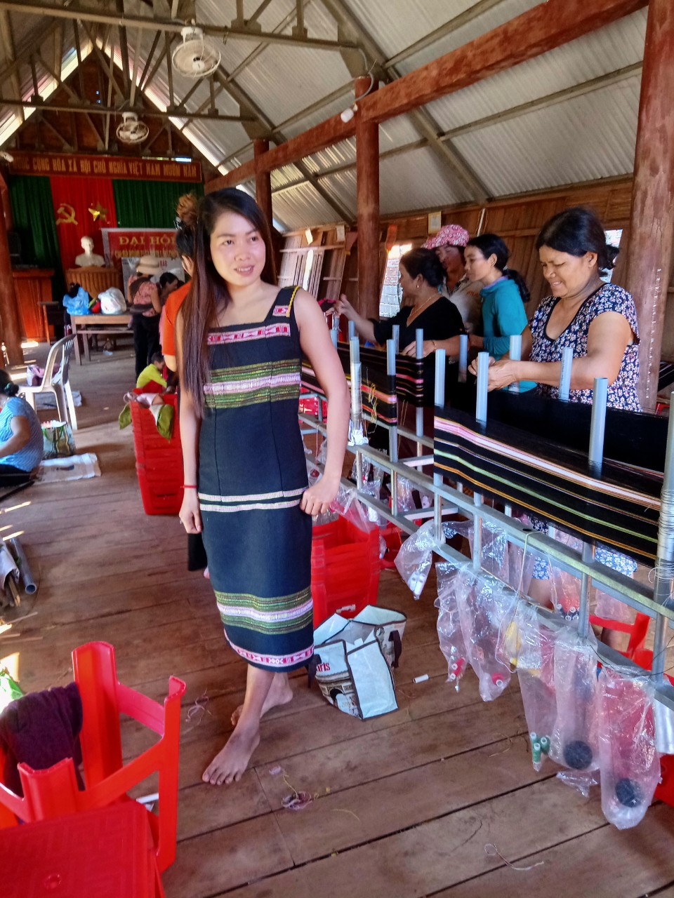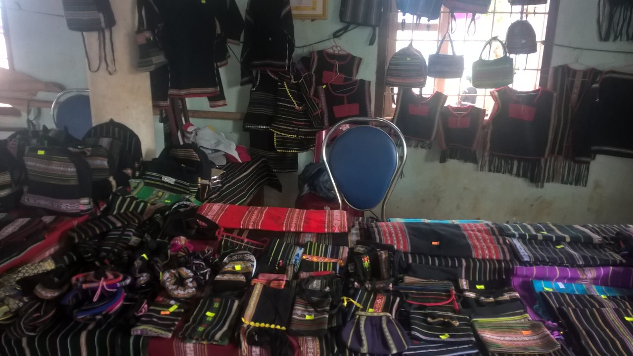 Tuy nhiên, để giải quyết đầu ra sản phẩm thổ cẩm của chị em cũng là vấn đề khá khó khăn, ngoài việc không ngừng năng cao chất lượng sản phẩm, thường xuyên cập nhật, thay đổi mẫu mã phù hợp xu thế thị trường. Hội LHPN huyện và xã đã phối hợp với các ngành đoàn thể của huyện mang sản phẩm dệt thổ cẩm của chị em giới thiệu đến với các cơ sở tôn giáo (điểm nhóm tin lành, Nhà thờ thiên chúa giáo, các trường học nội trú) trên địa bàn huyện, đồng thời đưa sản phẩm trưng bày quảng bá tại các gian hàng giới thiệu sản phẩm phụ nữ khởi nghiệp do các cấp Hội trong và ngoài tỉnh tổ chức, vì vậy mà sản phẩm dệt thổ cẩm của tổ hợp tác đã đến tay nhiều người tiêu dùng và được đánh giá rất cao về mặt thẩm mỹ cũng như chất lượng.